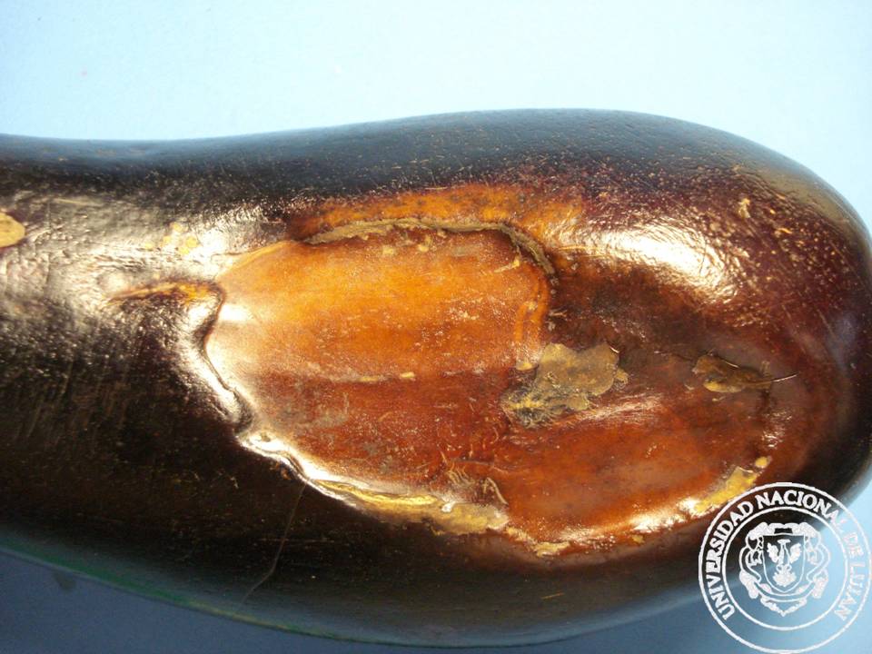 La antracnosis de la berenjena es producida por diferentes especies del hongo Colletotrichum, entre ellas se citan a C. acutatum; C. capsici y C. melongenae. Colletotrichum spp. produce acérvulas con setas color castaño oscuro y una masa mucosa de conidios (Fig. 5). Los mismos son unicelulares y hialinos. En algunos casos también se forman microesclerocios.