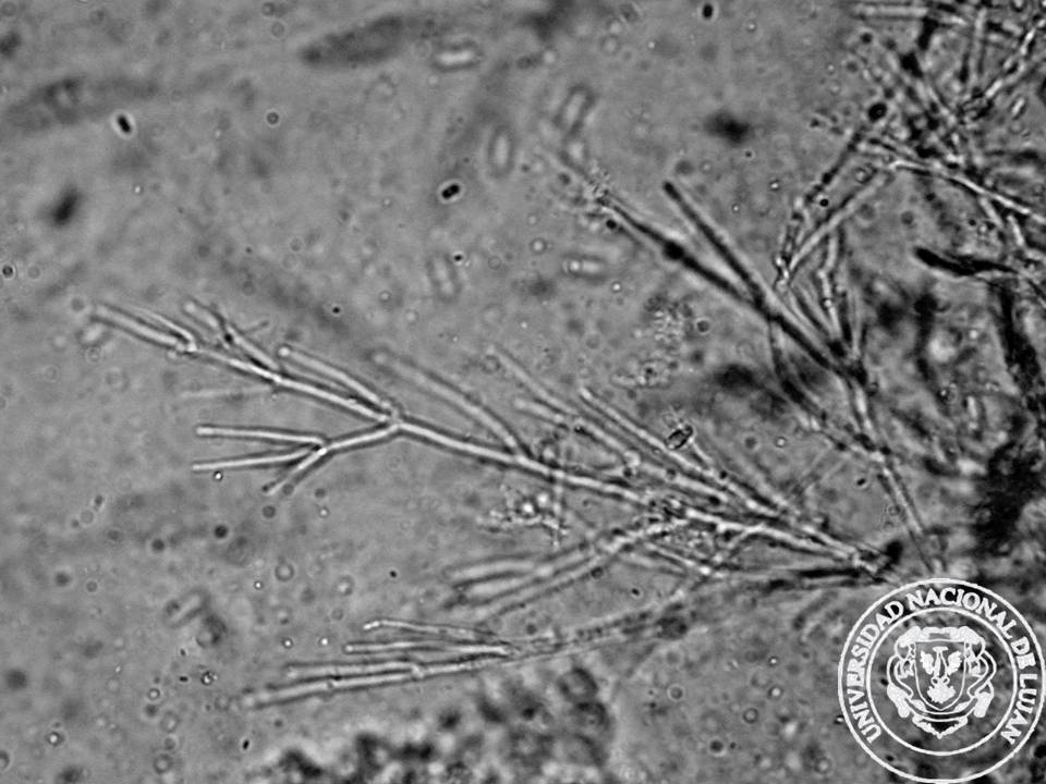 Estos microorganismos producen conidios unicelulares, hialinos, en conidióforos con ramificaciones verticiladas (Fig. 4). También forman abundantes microesclerocios en tejidos senescentes o muertos.